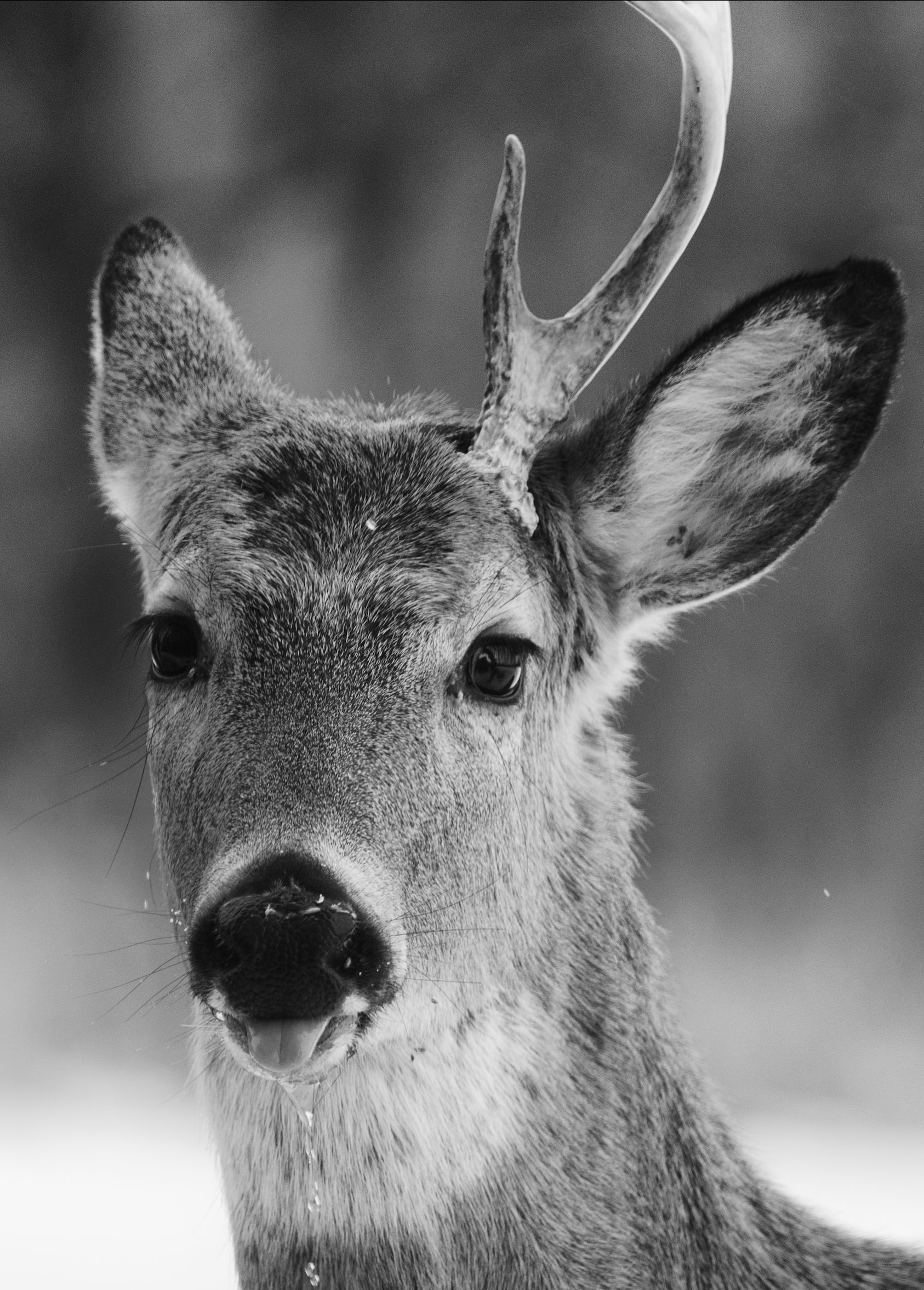 Lower right - "Young one horn" ranged the area. During the freezing cold, water would be locked (frozen) with no thaw for many days. When this was taken, he was drinking out of the heated bird bath. If you look carefully, you can see water dripping from his chin.